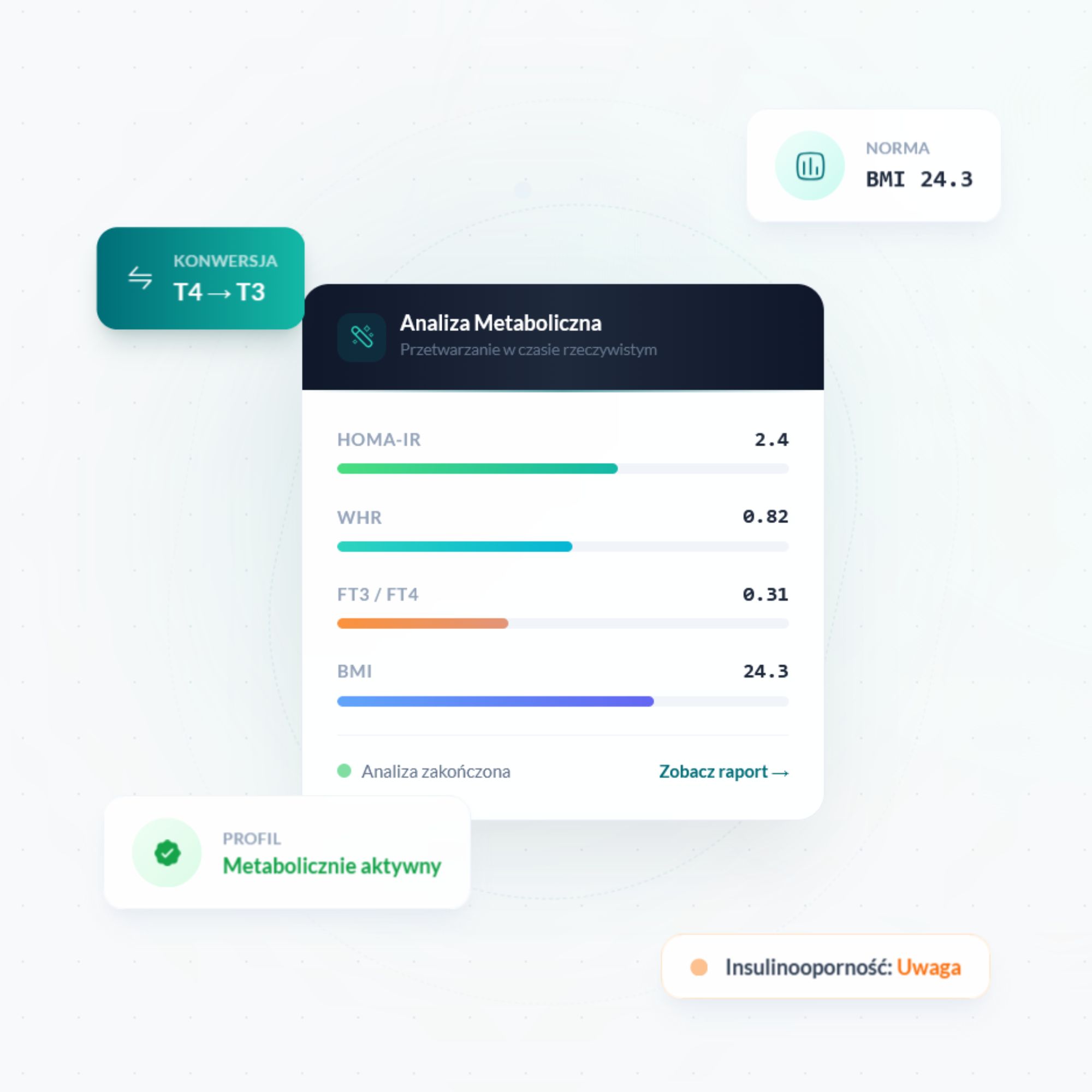 Zaawansowana diagnoza, która w 3 minuty wykrywa ukryte przyczyny tycia (insulina, tarczyca, kortyzol) i generuje plan naprawczy.